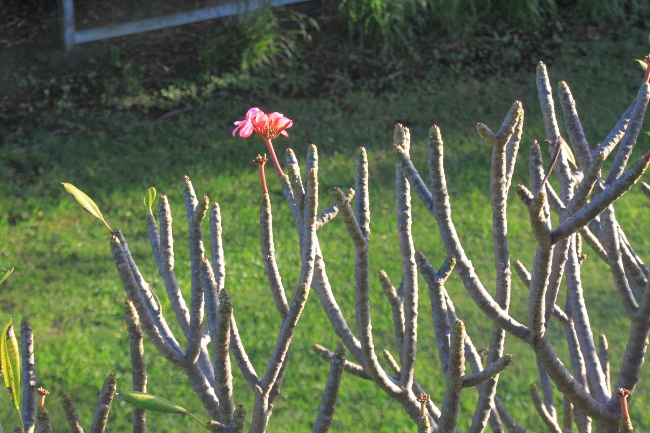 Plumeria trees have an unusual blooming strategy. When we got here on January 31st, the tree outside our window looked like this;